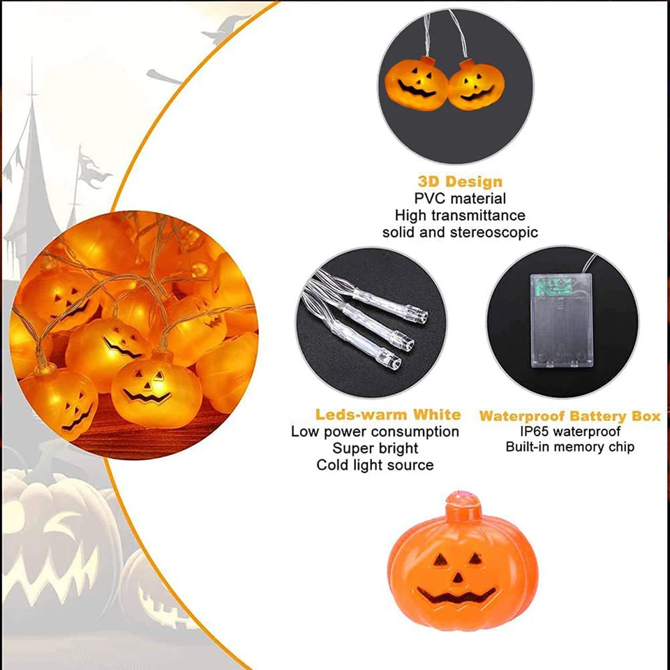 16 Led Halloween Pumpkin String Light Home Decoration Party Indoor Outdoor 9 Ft