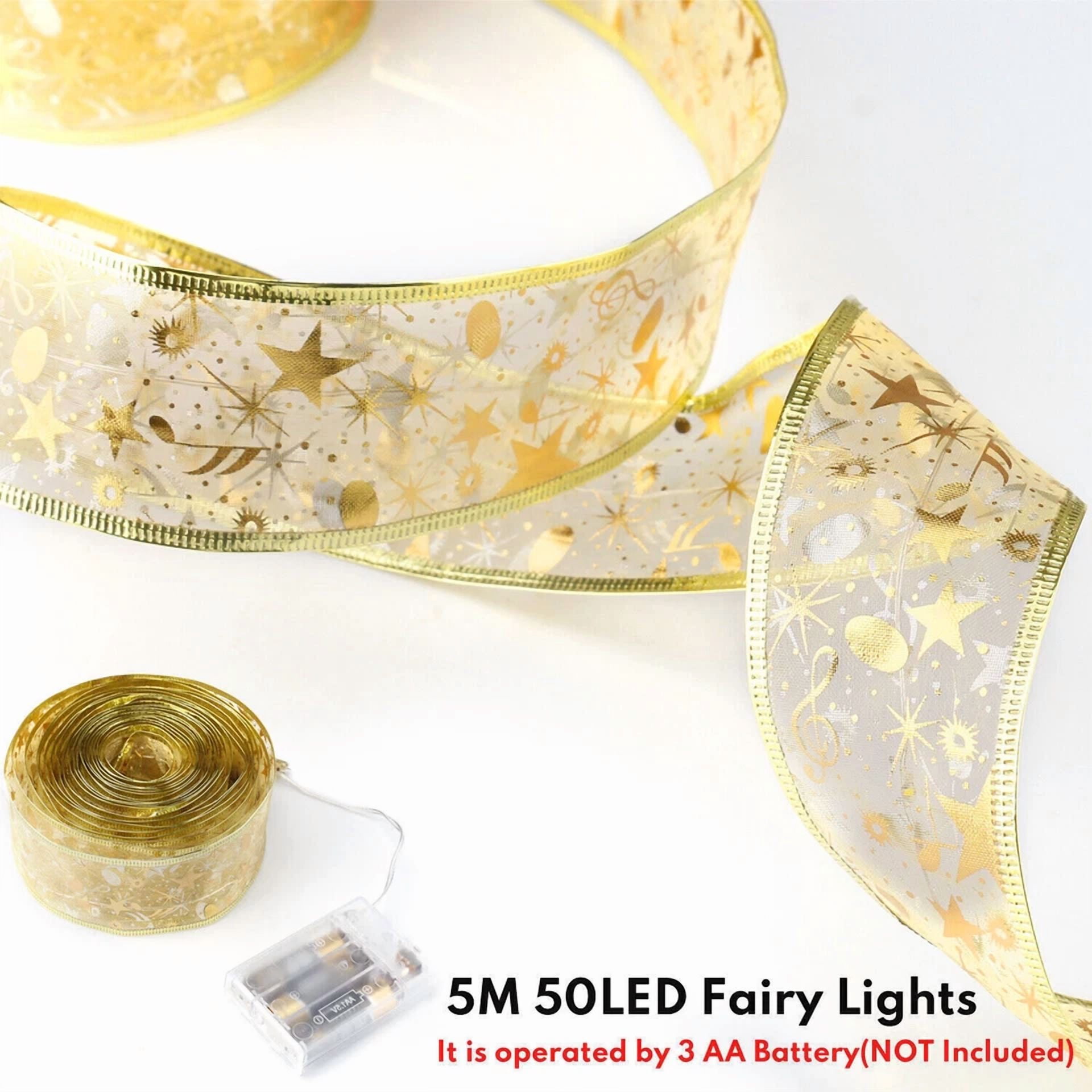 50Led 16.4Ft Fairy String Lights Battery Christmas Ribbon Bows Xmas Tree Decor