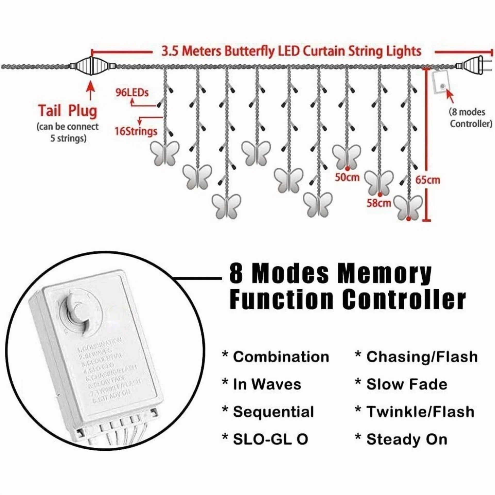 96 Led Hanging Butterfly Curtain Lights Outdoor Fairy Xmas String Wedding Lamp