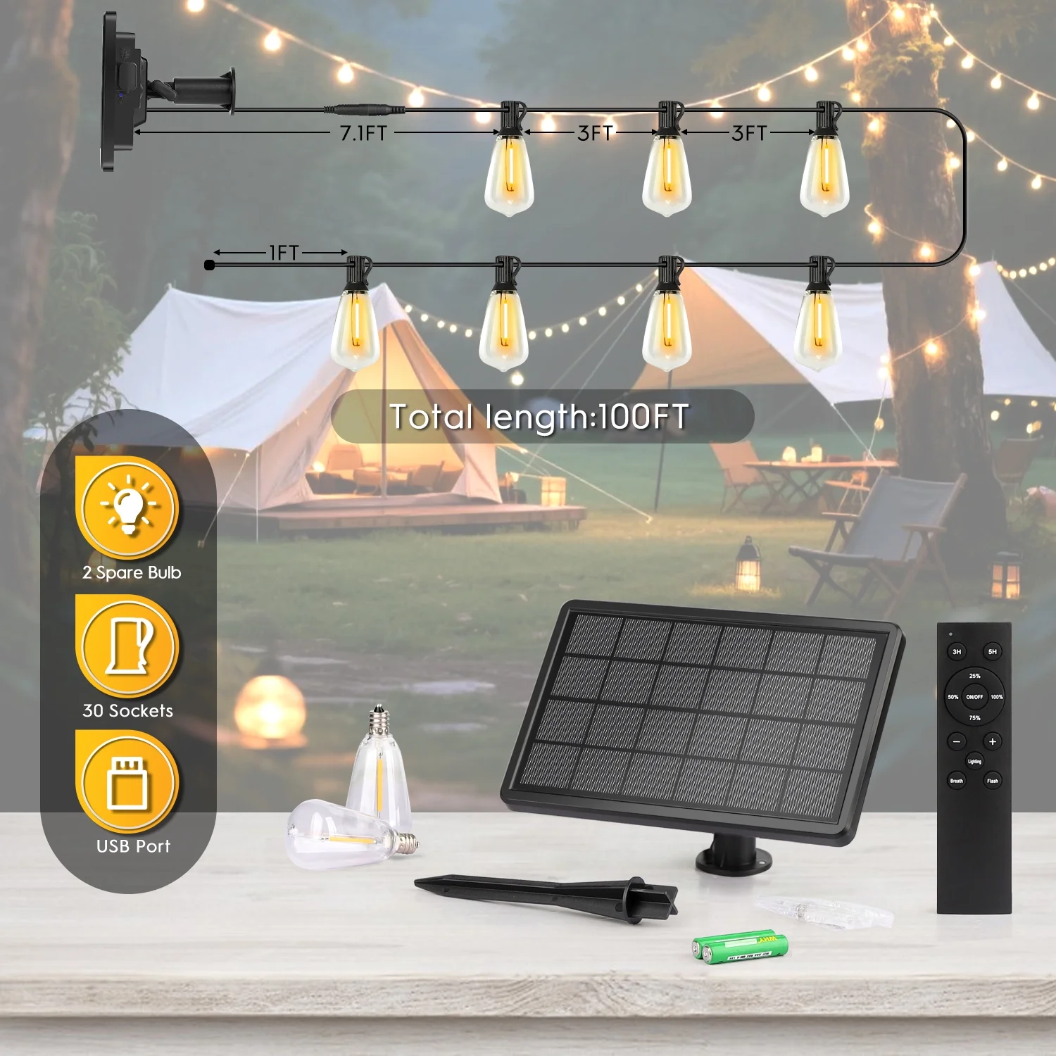 100FT Solar String Lights Outdoor Waterproof, Patio Lights with Remote Control & 30+2 Dimmable ST38 Edison Bulbs Shatterproof,Solar Powered String Lights for Outside Garden Backyard